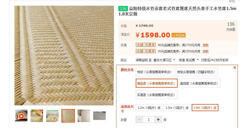 最近重庆都40几度了,我们家还在睡床单,不是我不怕热,而我觉得现在真的没得舒服的席子了刚才看到有个网友家里还在睡竹席子就是这种,我也觉得这种凉快,但是我不得睡,丑就算了,关键是不好收,而且容易坏,并且,这玩意现在还不便宜。在淘宝随便找了一个中档的,居然1.8米的要1600?