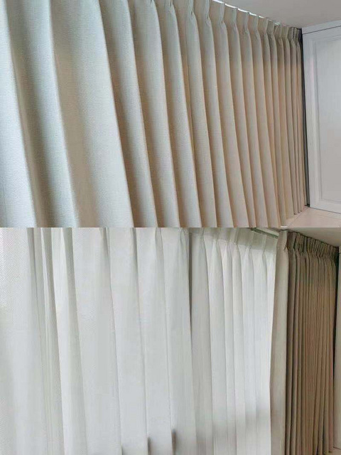 买了新款的米白色全遮光,比较喜欢它的棉麻肌理感,因为我们家飘窗是L型的,拉起来还蛮顺滑的没有卡顿晚上把灯打开,窗帘搭配白色的组合柜,效果还是很温柔的!