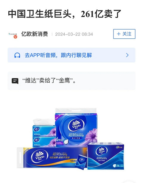 年收入近200亿的国民纸巾品牌维达,何以沦落到卖身的地步?看新闻看到了自己的头上,我家里还囤了一堆维达抽纸,卷纸呢... 转自亿欧新消费,侵删