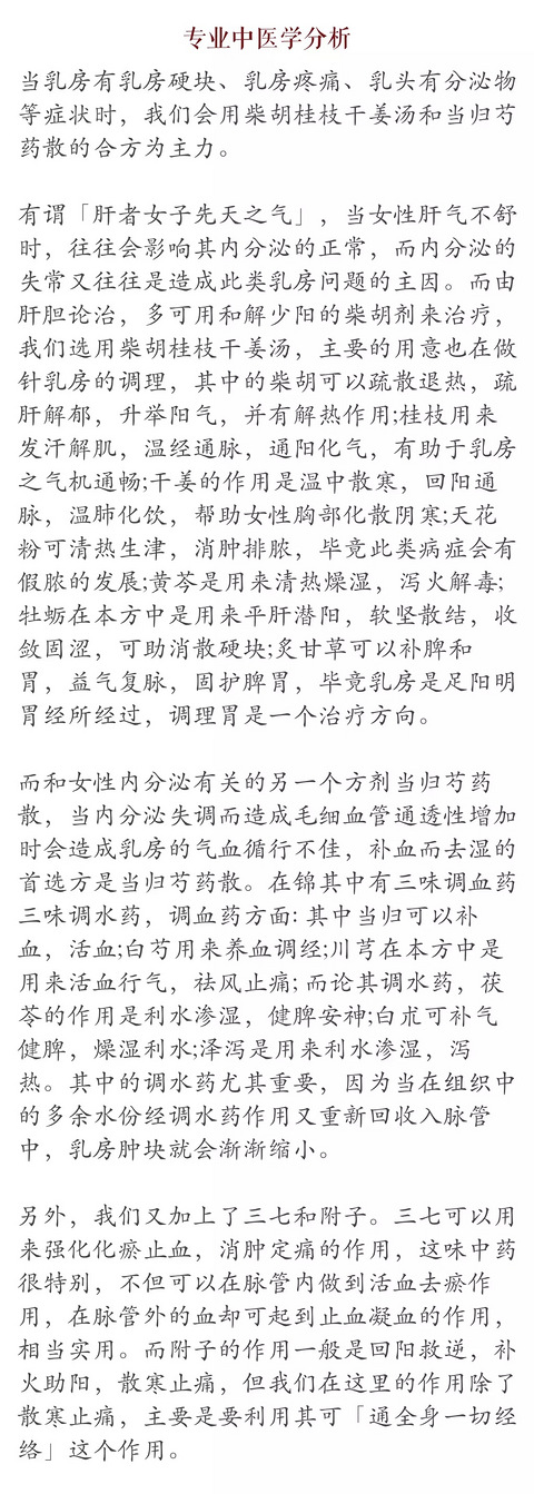 乳腺炎乳腺炎,顾名思义就是乳腺发炎引起的。我们依其发生的症状可以分别为两种,一种是滞留性乳腺炎(慢性乳腺炎),一种是化脓性乳腺炎(急性乳腺癌)。而化脓性乳腺炎通常是因为滞留性乳腺炎持续引发而产生的。以下就这两种类型说明如下:在中医治疗上,我们要分成非哺乳期间和哺乳期间来论治。在非哺乳期间的滞留性乳腺炎,其用方是加味逍遥散和桂枝茯苓丸的合方。而在哺乳期间,若是乳房发热红肿的化脓性乳腺炎,我们用排腲散