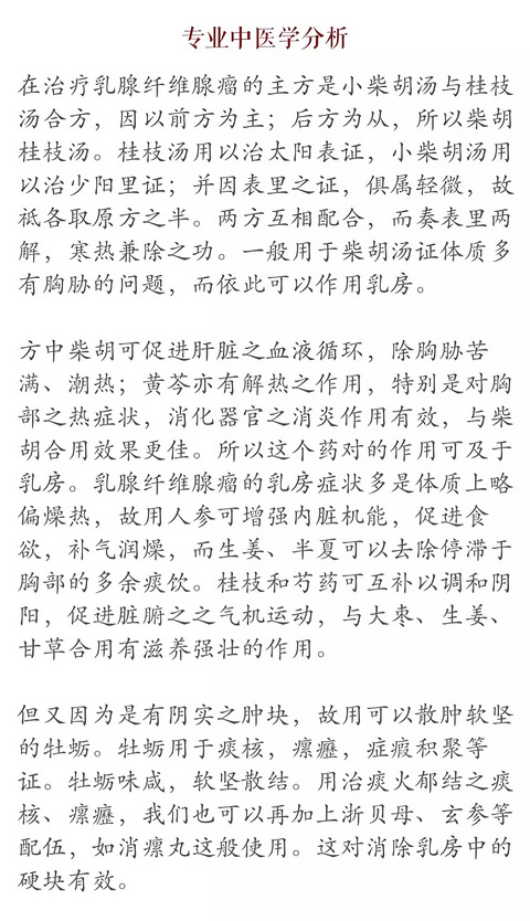01 女性乳房问题整体说明02 乳腺纤维腺瘤、乳腺增生03 乳腺症、乳房囊肿、乳管内乳突瘤04 乳腺炎、乳头炎05乳癌乳腺纤维腺瘤乳房纤维瘤的产生原因,一般认为是女性荷尔蒙分泌过剩所造成的,但真正的原因现在并没有定论。只是多发于30岁以下的年轻女性为多,这是临床上的统计。而中医的观点是认为这多是气机不畅而导致的局部阴实现象。此时再加上体质偏于燥和有些不当的痰液在乳房上形成实质的肿块。而且中医一直认