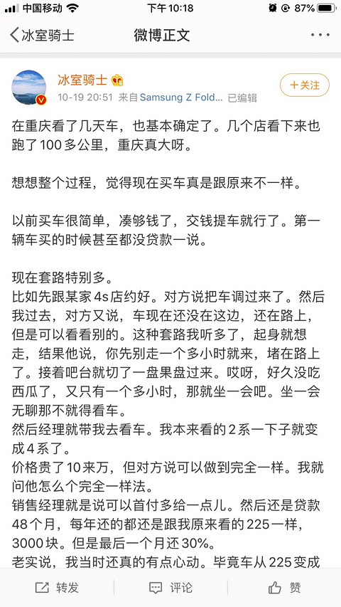看了个博主在重庆看车买车的经历,水真的楞个深?看完又多了个不换车的理由了,一定不是因为我买不起主要是我怕麻烦! 在重庆看了几天车,也基本确定了。几个店看下来也跑了100多公里,重庆真大呀。 想想整个过程,觉得现在买车真是跟原来不一样。 以前买车很简单,凑够钱了,交钱提车就行了。第一辆车买的时候甚至都没贷款一说。 现在套路特别多。