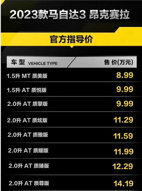 2023年6月30长安马自达发布了2023款昂克赛拉全系官降。起步价也来到了8万多。最值得推荐购买是9.9万元的2.0自吸自动质擎版。安全系数高;主副驾驶气囊,第一排安全气囊,安全侧气帘。膝部气囊。配置够用;后驻车雷达,倒车影像,定速巡航,发动机启停,自动驻车,上坡辅助,无钥匙进入,无钥匙启动,8.8寸中控屏幕,支持CarPlay和CarLife,8扬声器.LED远尽光大灯,全车窗一键升降,第二排