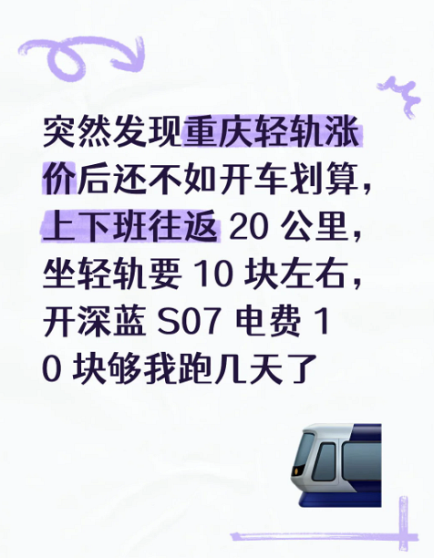 突然发现重庆轻轨涨价后还不如开车划算,上下班往返 20 公里,坐轻轨要 10 块左右,开深蓝 S07 电费 10 块够我跑几天了