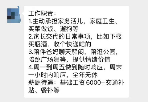 跟大家说个发生在身边的真事。 前几年在我们公司实习过的实习生小刘,离职后我俩一直保持着联系。小姑娘人挺优秀的,985毕业,能力和情商都在线,只是后来因为职业方向变化,实习结束后去了一家传统媒体。 本以为她会有一个好的发展,谁知道今年再联系,小刘跟我说,她已经回老家了。 问起她做什么职业,小刘开玩笑地说,自己现在给父母“打工”,做一个“全职儿女”。 说完还给我发了一张工作职责表: 转| 毯叔盘钱