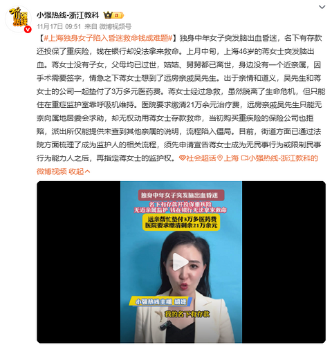 最近有个新闻引起热议,上海46岁蒋女士,有天突发脑出血被紧急送医抢救,但重症手术需家属签字,可送她去医院的只是个普通同事,没有权限。可蒋女士想了一圈后告诉医生:我没老公没子女,父母已去世,没有直系亲属,听完医生也呆在原地。最后蒋女士在昏迷前联系远房表弟,属于那种快出五服的亲戚,两人只会在过年时见上一面。表弟得知后,也立马到医院签字,还垫付3万的医疗费,咱摸着良心说,这表弟已够意思了。 可随着表姐治