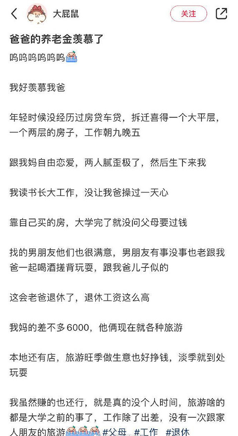 这位网友爸爸的养老金,真的羡慕了。我爸妈的也让我羡慕,反正比我工资高。 我的理想退休生活: