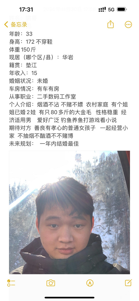我96年的奉节人,在渝北厂里上班,身高165。老家县城按揭房,有车真诚想交个女朋友(结婚的那种)。希望女生跟我差不多大吧,未婚的。