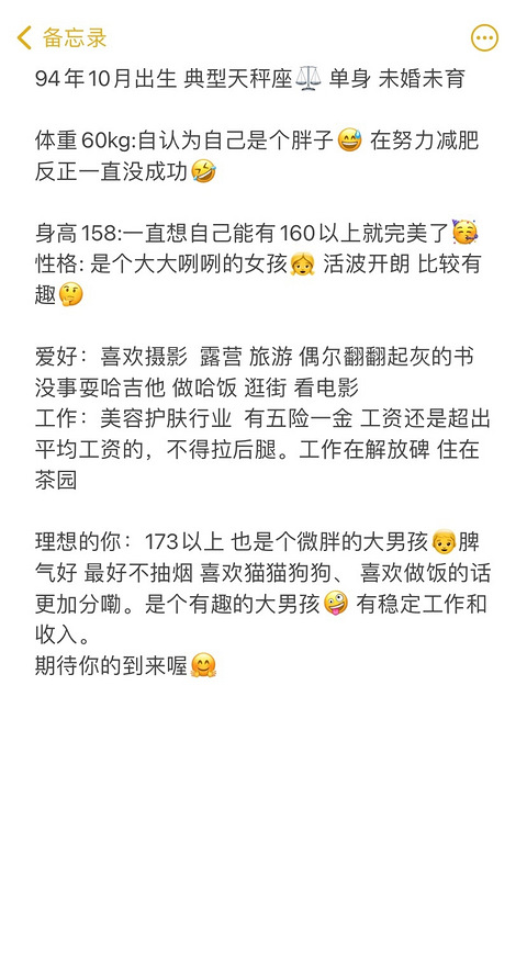 我:女,89年,未婚,158cm,55kg,独生子女,专科(继续教育本科),程序员,会做饭,有点温柔,会持家(盆友都说我有时候有点儿抠,哈哈哈),物欲不强,孝顺,重庆合川某村,有一点小粗心。期望你:男,未婚,170+,专科+,年龄上下4岁,不吸烟,最好会做饭(或者愿意学),可以一起做做家务,散散步,逛逛超市,聊聊八卦,谈谈天,不丑不胖,性格温和,不偏激,情绪稳定,孝顺,收入的话彼此差不大多。。。老