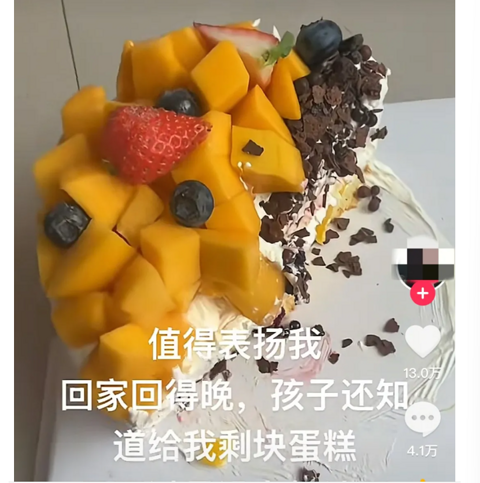 前几天,有这样一个视频在网上火了,评论区里4.1万条留言都是怒骂的。 一位妈妈拍下了孩子给自己留的半个奶油蛋糕,配上的文案却是: “值得表扬,我回家回得晚,孩子还知道给我剩块蛋糕,只不过没有奶油了,但这是孩子的心意。”