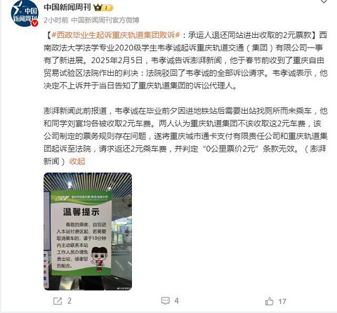 还记得去年西政毕业生告重庆轨道集团的新闻嘛今天看到败诉的新闻了其实生活中还是需要这种较真的人 虽然输了,还是希望以后能有所改变