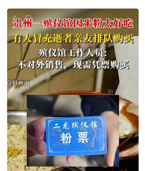 2025年年度沙雕新闻已经提前诞生了。 贵州一家殡仪馆因为做的米粉太好吃,民众开始冒充逝者亲属,到殡仪馆排队购买。