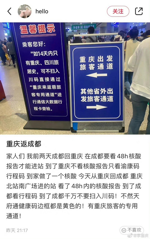 网友投稿,看到有人在成都东站拍到,重庆去成都的不用扫入川码,不需要做核酸,有重庆旅客专用通道,表示真是川渝一家亲! 据成都发布:五一去成都东站坐火车,重庆旅客14天内只有川渝旅居史的,经查验天府健康码、通信行程卡,在采样点不需要做核酸检测、不扫“入川码”,走重庆旅客快速通道可直接出站。 #网友称重庆回成都不用扫入川码了# #四川五一出游新规# #重庆游客入川与省内游客一视同仁#/cp]