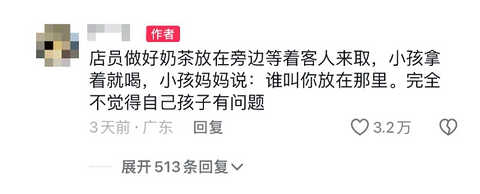 前几天,广州一家奶茶店门口发生的一幕,被挂上了热搜。 店员做好奶茶放在柜台上等客人来取,结果一小孩直接拿走就喝。 他妈妈也不管教,还气势汹汹地在那怒吼:“谁叫你放在那里。”