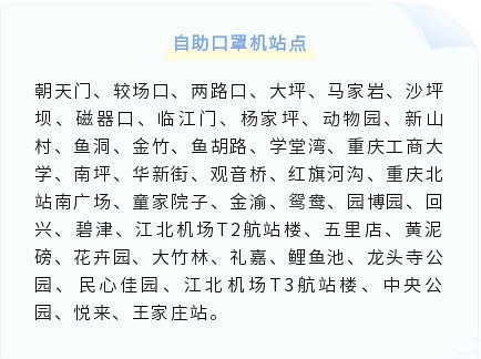 @重庆轨道交通 消息,截至目前,轨道交通1、2、3、6、10号线已有40台自助口罩机上线,口罩每包(10个)售价8.8元,支持微信支付,小伙伴们可以在以下站点购买↓↓↓