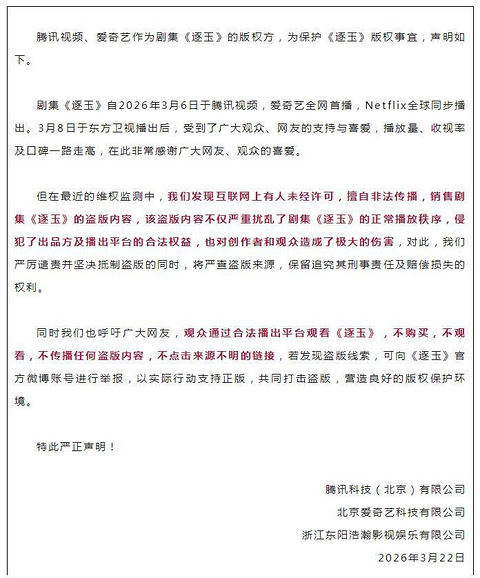 3月22日,热播剧《逐玉》的官方微博发布“严正声明”。