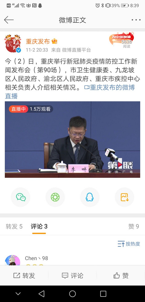 华龙网-新重庆客户端11月2日20时39分讯(记者 赵紫东)11月2日16时40分,长寿区报告一例新冠肺炎确诊病例,系九龙坡区确诊患者李某的密切接触者。 这是重庆市新冠肺炎疫情防控工作新闻发布会(第九十场)上,重庆市卫生健康委副主任李畔刚刚通报的最新消息。更多详情稍后带来。