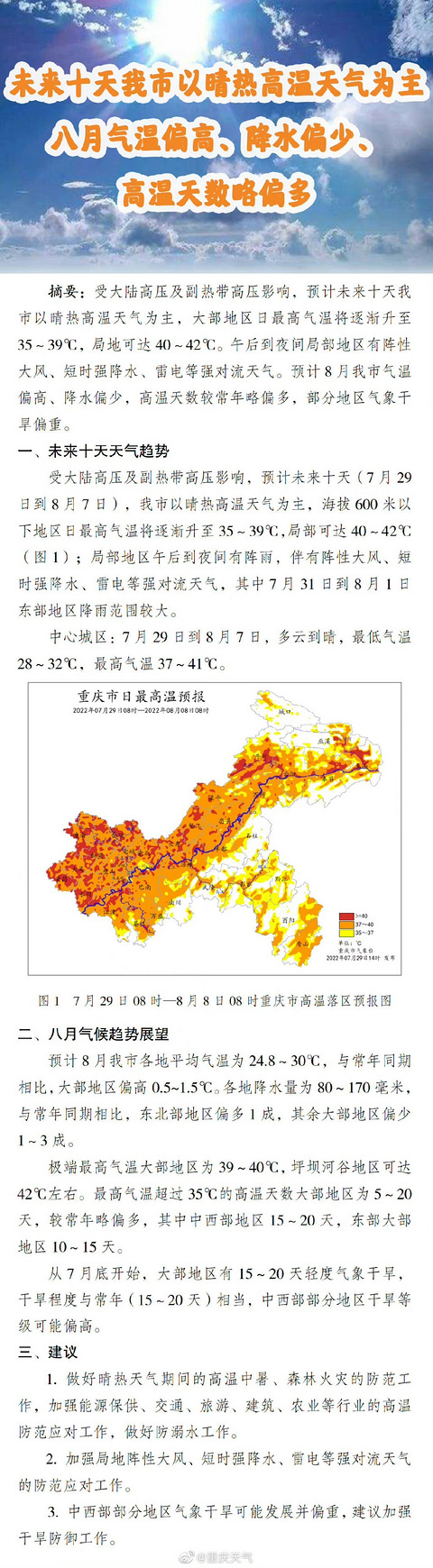 受大陆高压及副热带高压影响,预计即日起至8月7日,重庆以晴热高温天气为主,海拔600米以下地区日最高气温将逐渐升至35~39℃,局部可达40~42℃;局部地区午后到夜间有阵雨,伴有阵性大风、短时强降水、雷电等强对流天气,其中7月31日到8月1日东部地区降雨范围较大。 中心城区:即日起至8月7日,多云到晴,最低气温28~32℃,最高气温37~41℃。