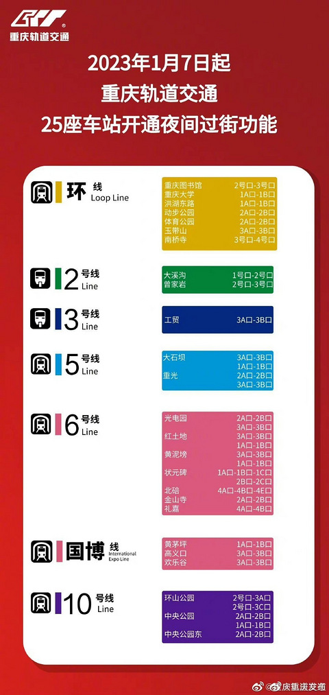 1月7日,动步公园、礼嘉、重光等25座具备条件的轨道交通车站出入口,将作为夜间过街通道正式投用,届时,车站运营结束后,乘客仍可通过车站的通道过街,无需再绕行。通过改造工程,这25座车站的过街通道新增了卷帘门、拉闸门,增补了视频监控,并增加了照明设备等,乘客可放心出行。#重庆城市服务台#(文/刘敏)