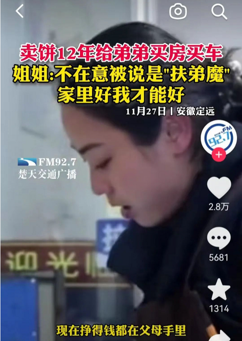 前段时间,被大家称为“伏弟魔天花板”的安徽潘女士火了。 标题为“卖饼12年给弟弟买房买车”的视频在网上评论点赞量很高。