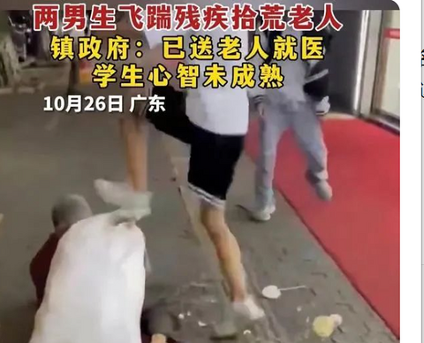 辱人以不堪必反辱,伤人以已甚必反伤!10月26日晚上,广东清远阳山县的一条街道上,两名学生无缘无故公然的对着一名拾荒的残疾老人大打出手,各种飞踹、脚踢、扔奶茶等一系列的卑劣手段层出不穷,让人难以置信这是两名学生能干出来的事!