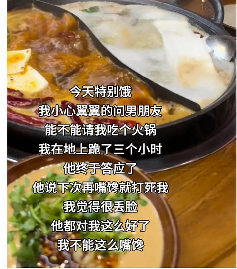 前段时间,有这样一类视频文案很火:“男朋友让我跪了3小时”系列。比如,想吃火锅,在地上跪了三个小时,男朋友终于答应了,还说下次再嘴馋就打死我;