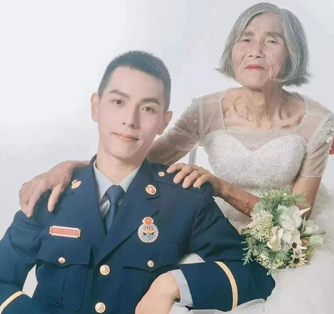 去年网络上的一张婚纱照,最近被人翻了出来。一位身着制服的青年,和一位身披婚纱的花甲老太太。 巨大年龄差的对比下,这张照片显得那么扎眼。