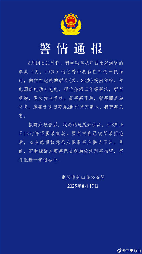 男子拒绝借宿、介绍工作等需求被杀害,重庆秀山警方通报
