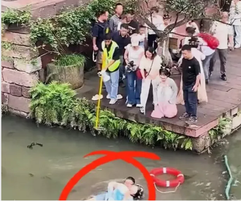 10月5日,四川宜宾那个很有名的李庄古镇景区,一个穿着一身漂亮古装的女游客,正美滋滋地在月亮田景区的“月映河池”边上拍照。可能她是想要找个不错的拍照角度,也可能是雨天路滑,一个没留神,一下子掉进深1.5米的人工湖里。