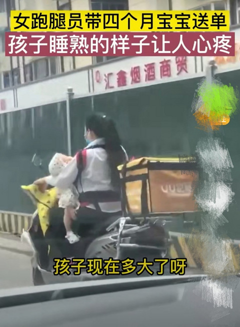 郑州女跑腿员带4个月宝宝送单,孩子睡熟的样子让人心疼。