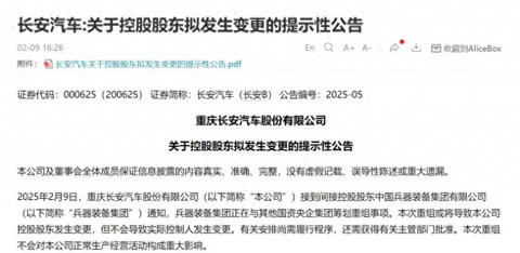 潇湘晨报?晨视频 2月9日,重庆长安汽车股份有限公司、东风汽车股份有限公司和东风电子科技股份有限公司均发布了关于间接控股股东可能发生变更的公告。 长安汽车公告表示,2025年2月9日,重庆长安汽车股份有限公司接到间接控股股东中国兵器装备集团有限公司通知,兵装集团正在与其他国资央企集团筹划重组事项。公告还说,本次重组或将导致本公司控股股东发生变更,但不会导致实际控制人发生变更。有关安排尚需履行程序,
