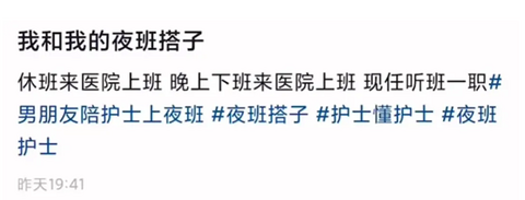 前几天,青岛某医院的一位女护士,和她的大花臂男友,一起被挂上了热搜。 起因是这位护士在网上发了一则帖子,炫耀男友对自己的宠爱:《我和我的夜班搭子》,夸男友白天上班,晚上下了班还要来陪她上夜班。