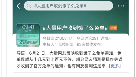 这两天很多网友都 莫名其妙地收到了饿了么的免单,金额从10元到100多不等, 甚至还上了热搜。