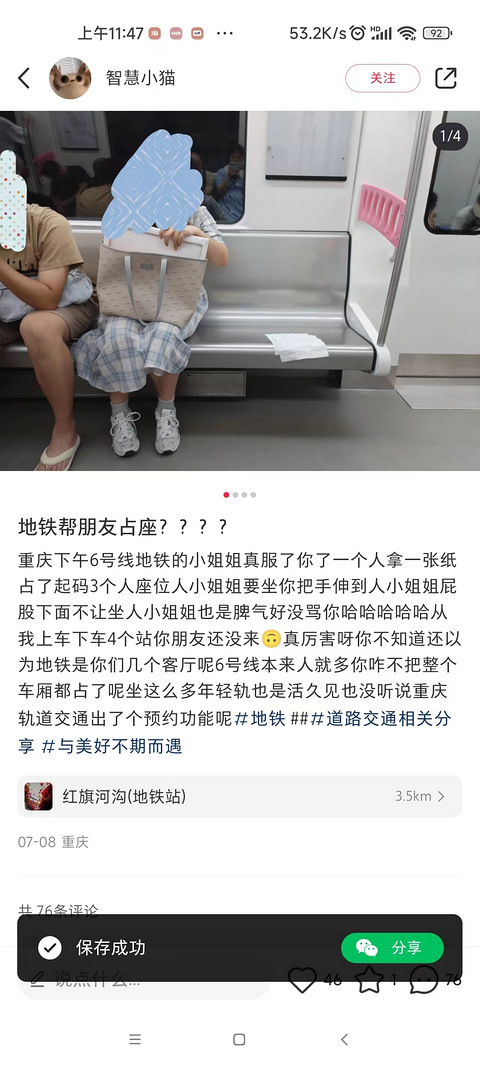 地铁6号线拿几张餐巾纸帮人占座?还有这种操作……