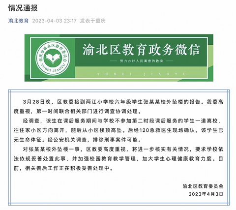 4月3日晚,重庆市渝北区教育委员会发布情况通报称,3月28日晚,区教委接到两江小学校六年级学生张某某校外坠楼的报告。该委高度重视,第一时间联合相关部门进行调查协调处理。 经调查,该生在课后服务期间与学校不参加第二时段课后服务的学生一道离校,往住家小区方向离开,随后从小区楼顶高坠。后经120急救医生现场确认,该学生已无生命体征。经公安机关调查,排除刑事案件可能。