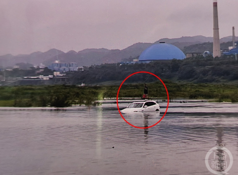 小伙江边全神贯注埋头造表 抬头一看江水已淹没车身