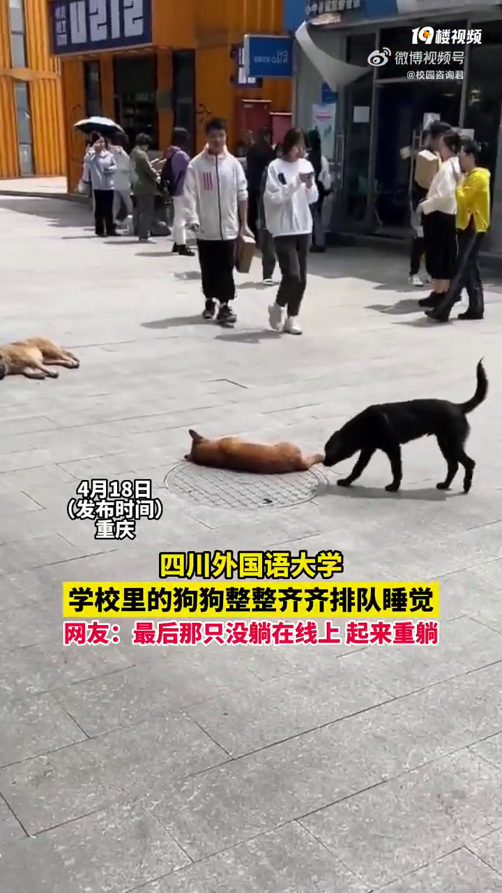 4月18日,重庆。学校里的狗狗整整齐齐排队睡觉,网友:最后那只没躺在线上,起来重躺!