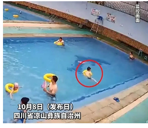 10月1日下午2点20分左右,在四川盐源县里的一家游泳馆。 很多人在泳池里玩。其中有个7岁的小男孩,本来抱着黄色游泳圈在游泳。但翻身的时候,泳圈突然从他手中脱落,漂到了远处。