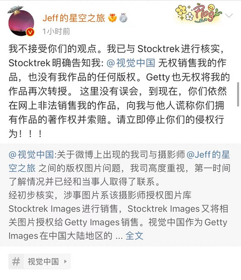华龙网-新重庆客户端讯(首席记者 王玮)重庆星空摄影师戴建峰使用自己的照片被告知侵权事件持续发酵,在昨(15日)晚视觉中国作出回应后,戴建峰本人也在16日上午发布转发@视觉中国的回应表示:“不接受你们的观点”,并要求视觉中国停止侵权。 “我已与Stocktrek进行核实,Stocktrek明确告知我:@视觉中国 无权销售我的作品,也没有我作品的任何版权。Getty也无权将我的作品再次转授。 这里没