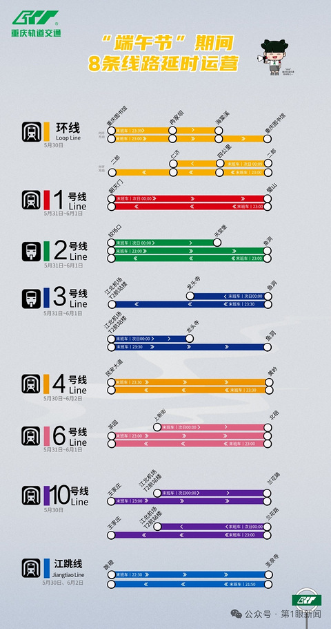 在端午小长假来临之际重庆交通开投集团轨道运营公司通过多种方式提升运输能力助力乘客朋友们便捷出行延长运营时间5月30日10号线(兰花路→江北机场T2航站楼)延长运营60分钟;10号线(江北机场T2航站楼→兰花路)延长运营40分钟;4号线(民安大道?黄岭)延长运营30分钟;江跳线(跳磴→圣泉寺)延长运营60分钟;江跳线(圣泉寺→跳磴)延长运营40分钟;环线(重庆图书馆→冉家坝→重庆图书馆、二郎→四公里