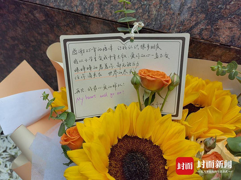 重庆球迷的手写信。 封面新闻记者 李茂佳 曹钰 5月23日上午11时许,重庆两江竞技俱乐部大厅,一盆盆长势喜人的绿植被三轮车陆续拉走。“俱乐部解散了,这些绿植用不上了,老板叫我来把它们全都运回花店。”三轮车司机说道。 而在10米外的大门口,陆续有球迷手捧鲜花、眼含热泪,来到俱乐部。不一会,门外就整整齐齐地摆放着一排排花束。 正中间的向日葵花束中,一张纸条记载如下字句:“感谢25年的陪伴,让我认识