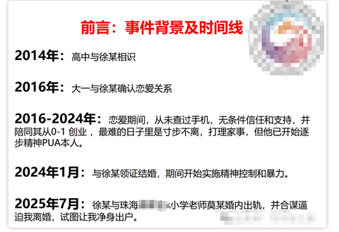 原配与徐某奇的感情,要从2014年高中相识说起。2016年原配大一那年,两人确定恋爱关系,此后8年,直到2024年1月两人领证结婚,原配都无条件信任徐某奇,从未查过他的手机,还陪着他从0到1创业,最难的日子里寸步不离,一边打理家事一边支持他的事业。