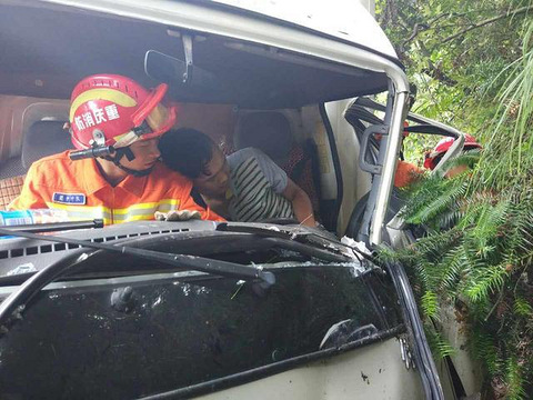 梁平区屏锦镇318国道附近发生一起交通事故,一辆大货车撞向路边山体,车窗玻璃散落一地,车头严重变形。接到报警后,辖区消防官兵赶到,破拆受损货车救出被困人员。据悉,在事故前,因驾驶员处置得当才赢得了生还的机会。