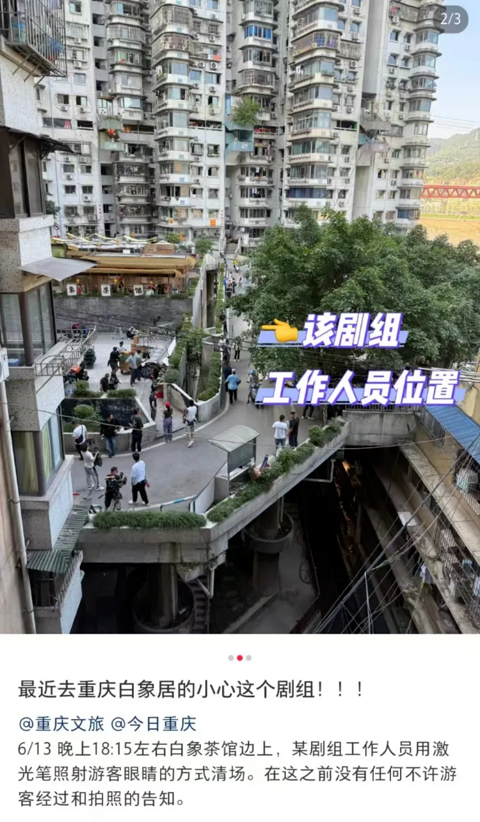 近日,由优酷与阿里影业联合出品的电视剧《她的瞳》正在重庆进行拍摄。一名上海游客发帖称,自己6月13日在重庆网红打卡点白象居拍摄风光照片时,被该剧组清场的工作人员使用激光笔照到眼睛,导致受伤。 6月16日,当地街道办回应上游新闻记者,当天已经约谈剧组,要求拍摄不能影响游客和居民,否则会采取相应措施。 ▲游客发帖称,被剧组清场的激光笔伤到眼部。/网络图