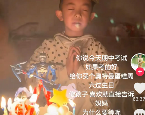最近,有这样2个视频很火,放在一起简直就是天差地别的对比。 第一个视频获得了63万的点赞:一个小男孩正闭着眼对着一个奥特曼蛋糕许愿。