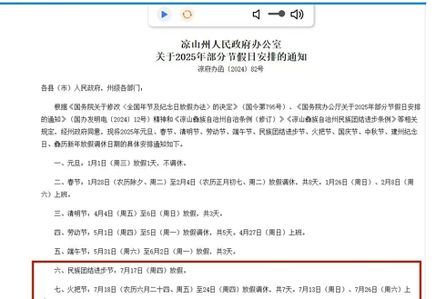 据四川凉山州人民政府办公室此前发布的关于2025年部分节假日安排的通知火把节7月18日至7月24日放假调休共7天除了火把节7月17日的民族团结进步节也将放假1天总共可以连放8天假 7月13日(星期日)、7月26日(星期六)2天调休上班