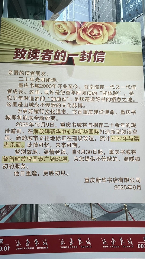 前段时间GO妹在网上看到解放碑新华书店要暂别的消息10月9日后将在原址进行改造再见就是2027年了期间想去看书就只有到国泰广场