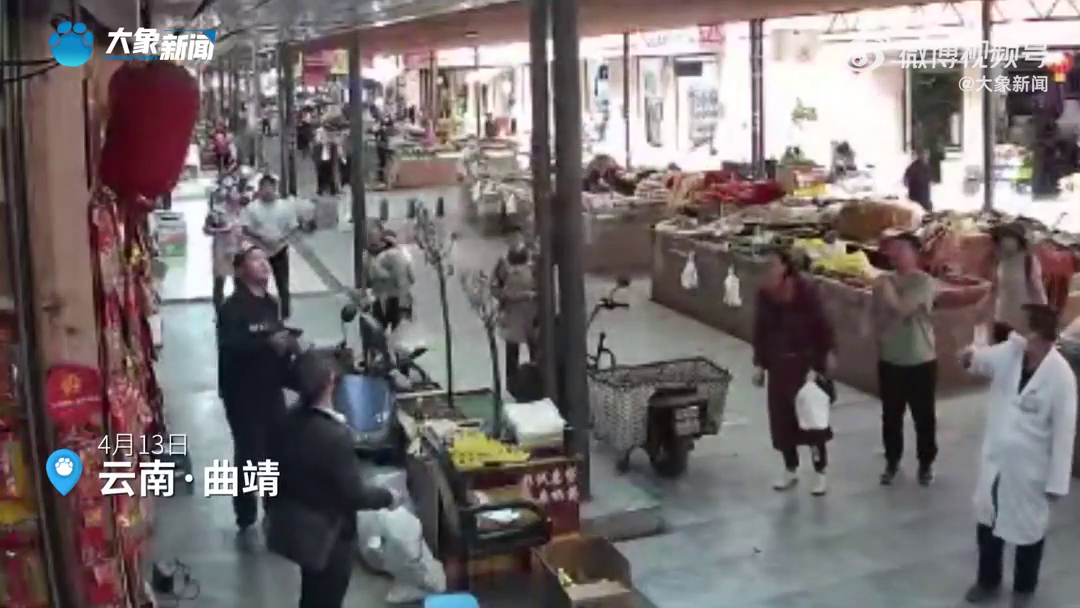 4月13日,云南曲靖某菜市场。 一五六岁左右的女童先是从三楼坠落到一楼商铺的雨棚上,之后从雨棚掉下来的瞬间被店主唐先生徒手接住。据唐先生介绍,当时他在店里忙活,听到砰的一声巨响,观察后发现一个孩子正在自家门店的雨棚上大哭。 “小孩是我们店铺三楼的,自己翻窗户掉下来了,正好掉在我们店铺的挡雨棚上面,距离地面大概四五米。”唐先生回忆,孩子从雨棚坠落瞬间,他出于本能反应,徒手接住了孩子。 事后提及此事,