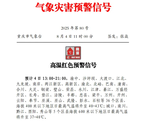 8月4日11时, 重庆市气象台再次发布高温红色预警信号:预计4日13:00-21:00,渝中、沙坪坝、大渡口、江北、 九龙坡、南岸、两江新区、高新区、渝北、北碚、巴南、潼南、合川、大足、铜梁、璧山、荣昌、永川、江津、綦江、万盛经开区、长寿、垫江、涪陵、丰都、忠县、梁平、万州、开州、云阳、奉节、巫溪、巫山、武隆、彭水、石柱等36个区县, 海拔400米以下地区日最高气温将升至40-43℃;城口、南川、