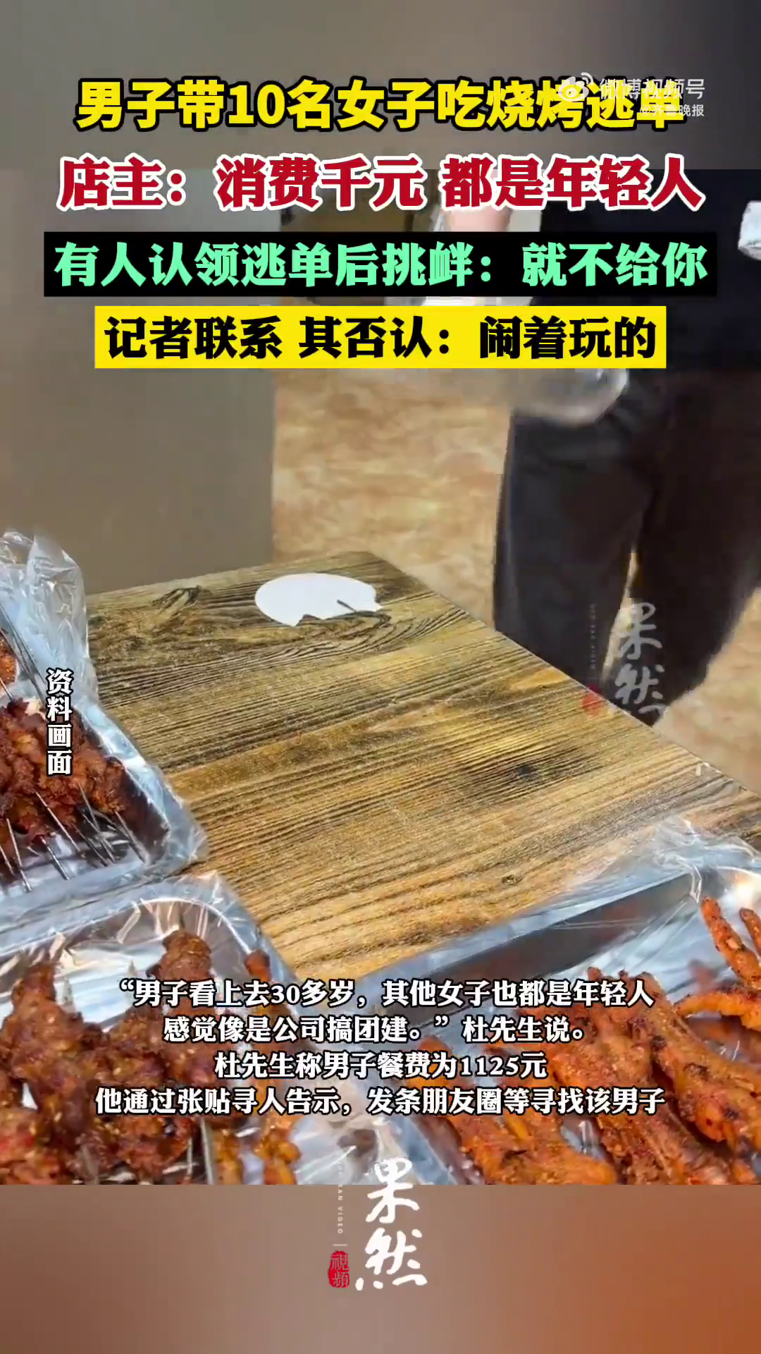2025年2月,在辽宁大连开烧烤店的杜先生接待了一桌顾客,这桌顾客消费了1000多元,但是一桌十余人最后没有买单便离开。杜先生当时报了警也发布了“寻人启事”,但一直没有下文。 近日,杜先生把当时的视频发布在网络上,随后“男子带10名女子吃千元烧烤逃单”话题成为微博热搜并引发讨论。 via(综合半岛晨报)